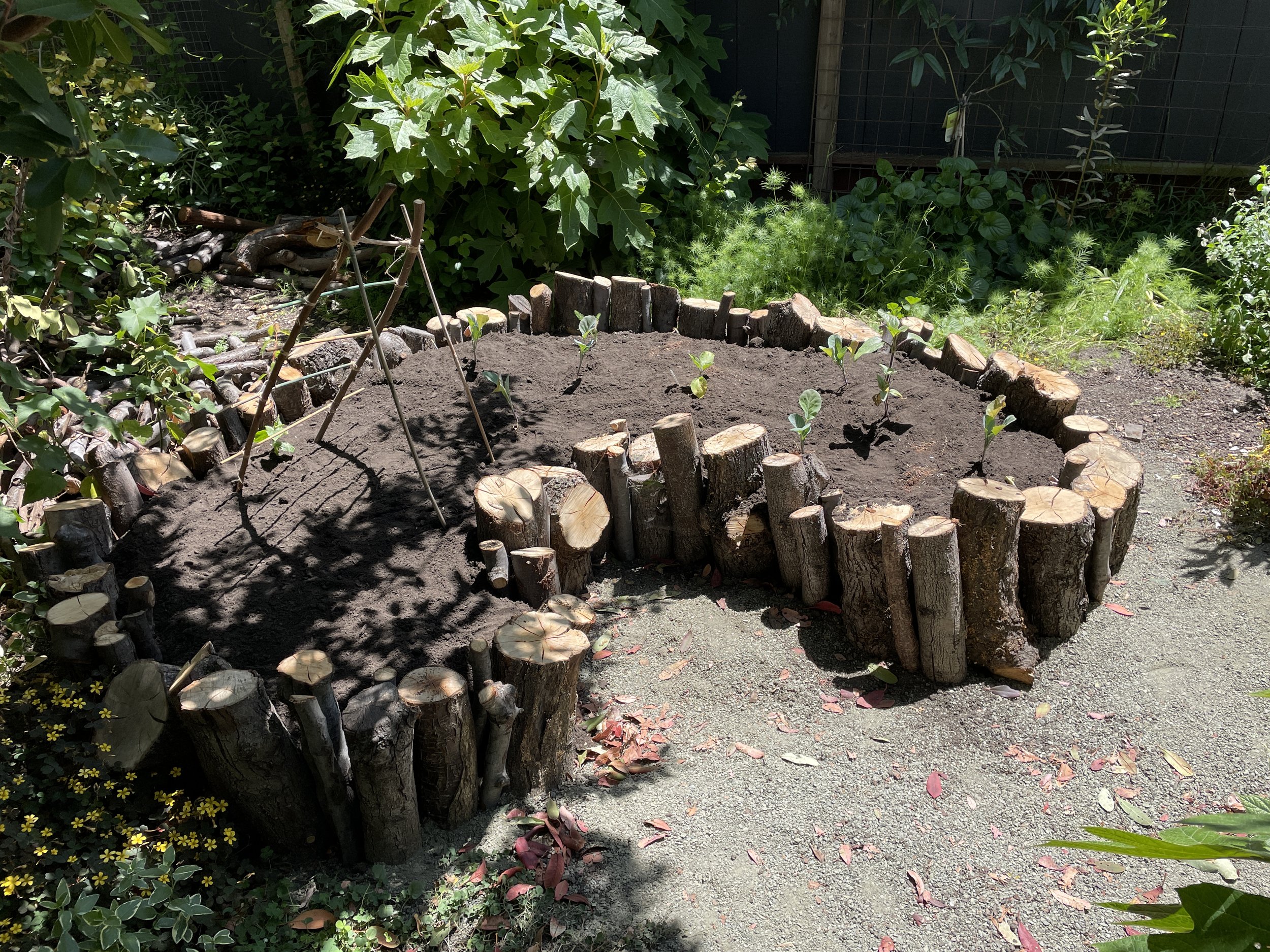 Images from the installation of our keyhole hügelkultur bed, inspired by the final project from my Permaculture class. We used offcut logs from our winter tree trimmings, and layered the interior of the bed with mulch, green yard clippings, and soil.