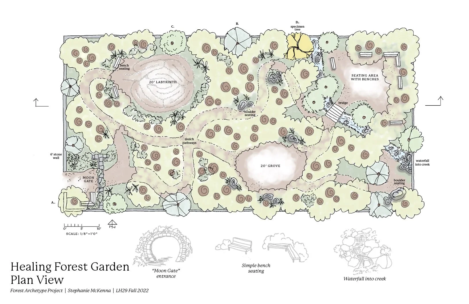 A selection of projects from a class focused primarily on planting design. The final project was a residential landscape in San Francisco, and I challenged myself to create a planting plan for the space that included mostly hyper-local plant species native to San Francisco. Earlier in the semester, we worked on a project centered around landscape archetypes, for which I designed a healing forest garden.